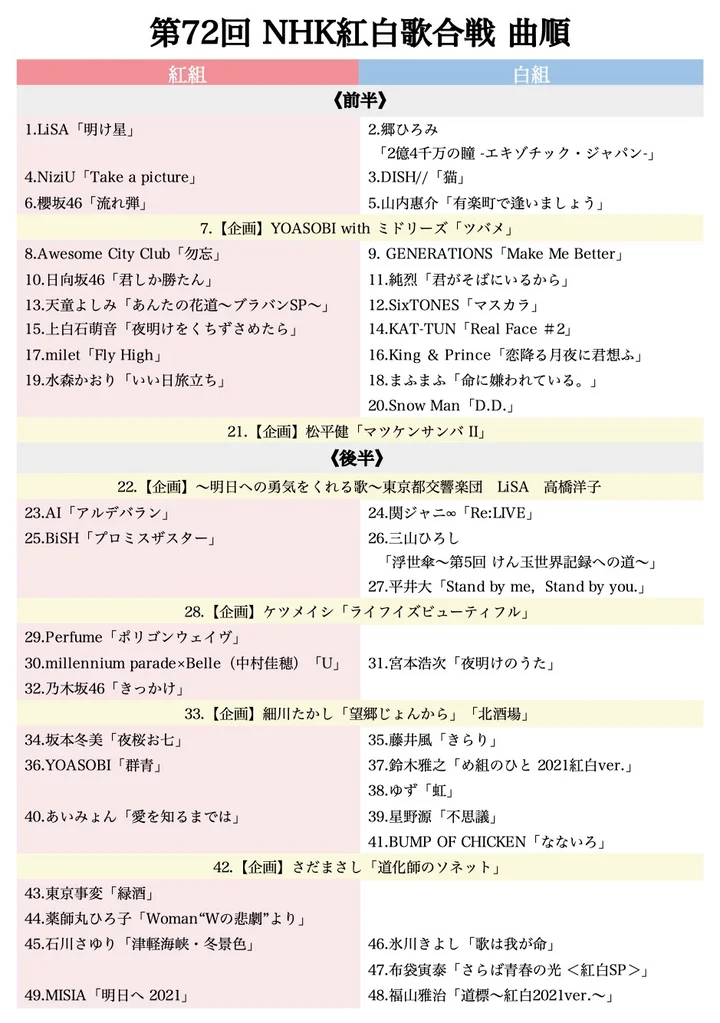 Web 紅白歌合戦2021年のタイムテーブル順番曲順は NHK発表 2021年12月31日 午後6時04分 Tweet シェア 紅白歌合戦2022年の出演者一覧を発表 2021 年の大. Web 第72回2021年紅白歌合戦 出場歌手曲目曲順を掲載しています スポーツニッポン新聞社の公式サイトです 新聞購読とバックナンバーの. Web このページでは紅白歌合戦2022-2023のタイムテーブルを分刻みでリアルタイム更新していきます 各出演者の出演時間順番曲もあわせて記載 分刻みの.